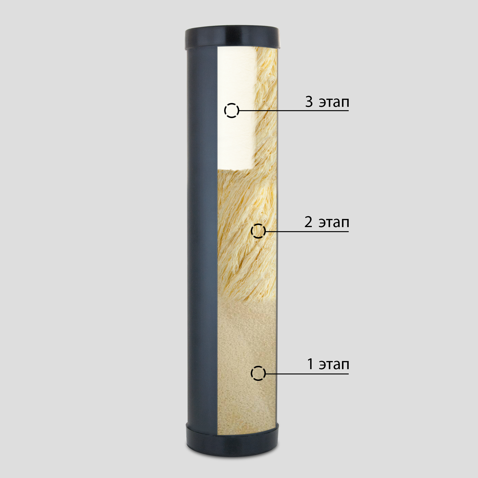The second stage is a filter for coarse purification and postoxidation of Fe (II) to Fe (III). When water passes through the fiber, iron compounds dissolved and dispersed in water are removed. The fiber is processed to form a complex of functional groups on its surface that ensure maximum extraction of iron compounds (iron oxides, iron salts, etc.).