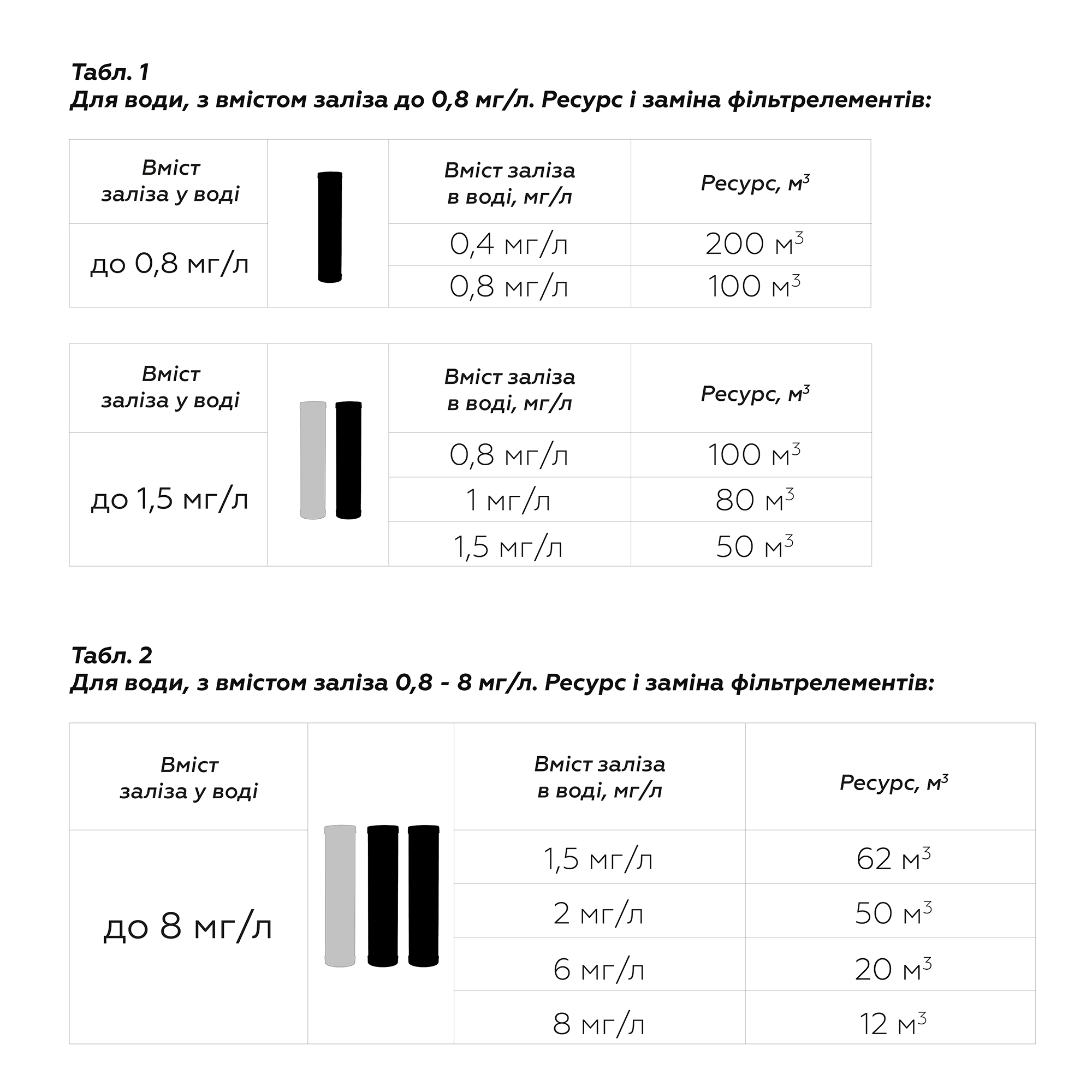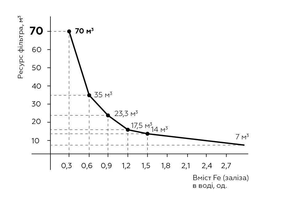 *При повышенных значениях железа (Fe) и жесткости ресурс определяется по графикам на рис. 2 и 3.